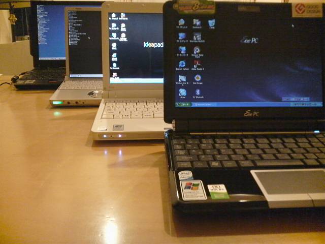 結論はこうなりました(爆)奥の2台は現用機、手前の2台が今回の新規導入マシン。LenovoのS10e(IdeaPad)とASUSのEee PC 901-16G。