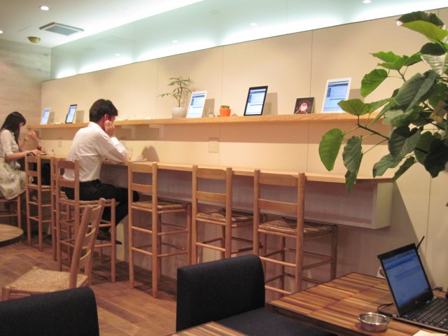 かねてからの予告どおり電子書籍の読めるカフェ、としてiPadがお店のディスプレイを兼ねてカウンター席の上に整然と並べられている。しかも壁面にはコンセントとEtherの口。