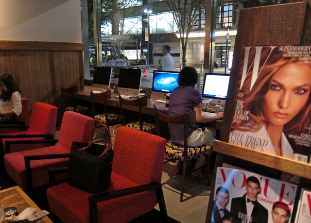例によってカフェカンパニー系お約束のネット端末(こちらはちゃんとMac OSが入ったMac)が窓際に。さらに入口脇のマガジンラックにはコラボしたCONDE NASTグループの雑誌(VOGUE,GQ,WIRED等)が並べられている。