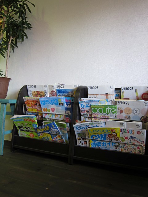 壁面脇のマガジンラックには雑誌が少々…って、ん?!全部地域のタウン誌、しかもラインナップが全国レベル。勿論地元山形の月刊山形ゼロ・ニィ・サンはもとより、お隣仙台のS-style、Tjとやま、Lazuda(島根)、月刊タウン情報クマモト等々20種類ぐらいの新刊を取り揃える。