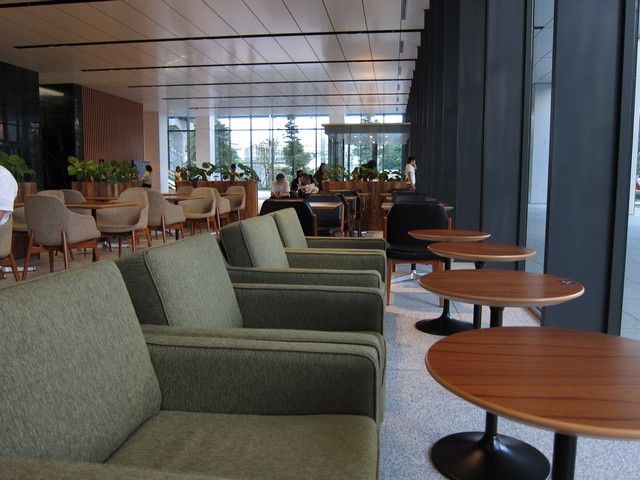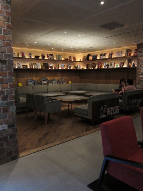 客席はだだっ広いエントランスの窓際にテーブル席が30ほど、窓側に向かってソファー席が5,6席ほどといった構成。奥ではちょいと打ち上げっぽくアルコールが入っているよう。