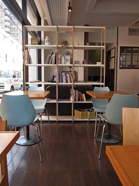 奥のソファー席との仕切りには棚でアクセントを、そして書物と小物雑貨が少々。