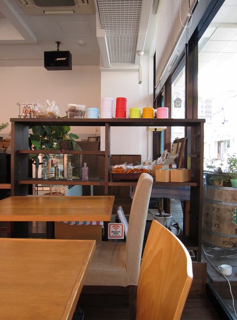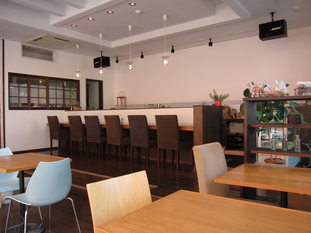 入ると自家製の焼き菓子が出迎える。正面奥がカウンター席とカウンターキッチン、左手に客席がありだいたい20席ほどか、シンプルながらも壁面の白、床の茶色にところどころの椅子の水色が清楚に纏まったハコ。