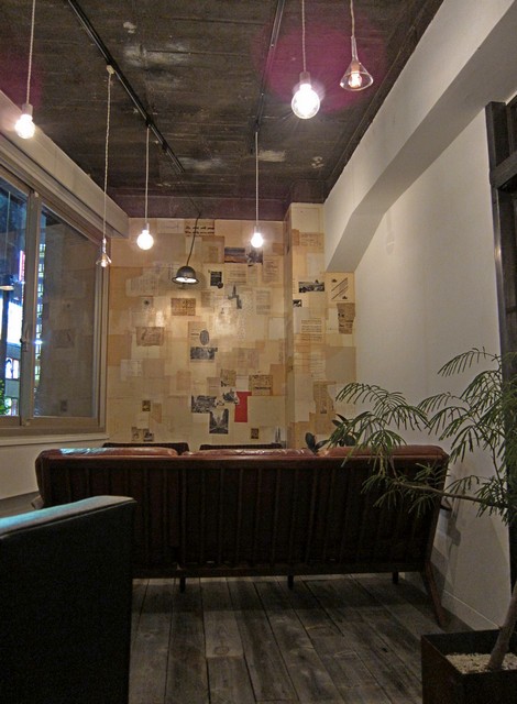 そして奥は少しカラーが変わってローテーブル系のソファー席となっており、壁面は古紙のコラージュ。