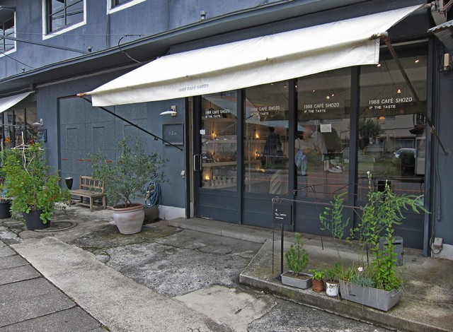 黒磯駅から少し南の板室街道を西へ歩くこと10分ほど、駐車場の看板が見え、そして灰色の長屋アパートっぽいファザードが、今回は勿論こちら、カフェ業界のある意味聖地でもある、1988 CAFE SHOZO、那須にある2つのSHOZOのうち、いわゆる「町のSHOZO」である。