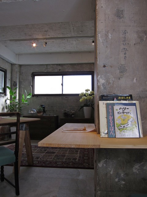 店内はほぼスケルトンのハコをそのままに、キッチンとテーブルを置いた構成。奥に長く手前にテーブル席が12、奥にちょっとしたミーティングもできる大テーブル席と非常にシンプルな構成。