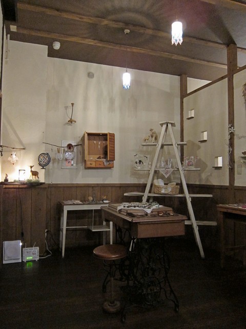 後ろにはアンティーク小物に混じって特大のスピーカーが。そしてそこからクリアな音のジャズが流れる、確かに音響系は一味違う。