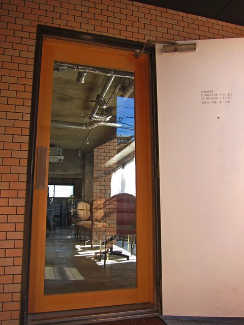 半オープンな階段を上がって現れるスケルトンな店内がガラス張りの扉から見えるお店、あぶくり サンドイッチとコーヒー