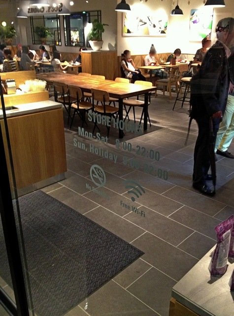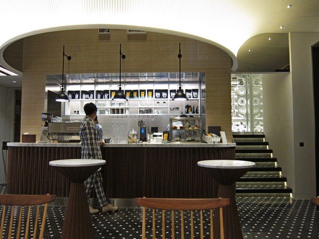 入ると右手(西側)にレジとカウンターがあり、左手に長く客席が50席強ほどの比較的大きめのハコ。家具の形態のチョイスも配置もハコもかなりスタバを意識したような様子がありありと感じられる。