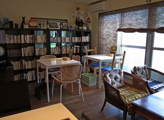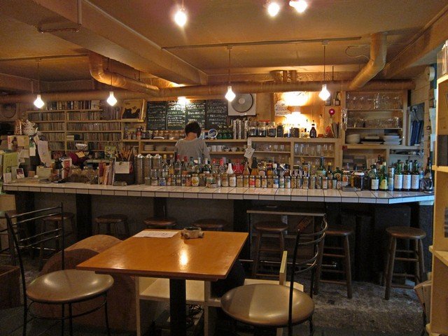 入ると右手(商店街側)と左手に別れ、左手側の禁煙フロアは南側が一面本棚で占められ、どこかお家っぽい雰囲気のハコにテーブル席が12席ほど。一方右手側にはカウンター裏にキッチンがあり、そちらは6,7席ほど。
