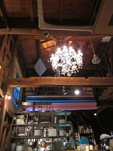 蔵の中の客席は4つのソファー席を含めて12席ほど。シャンデリアを中心とした電球色が蔵の雰囲気をもり立ててくれる。