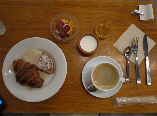 パンはクロワッサン+カイエ・ド・ブルヒ+コーヒーをチョイス。基本はこれにタルト(今回は林檎)+フルーツが付いて\600とはなかなか。