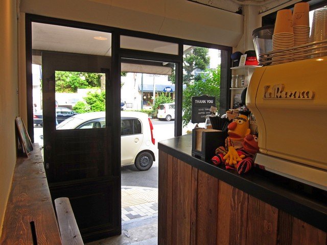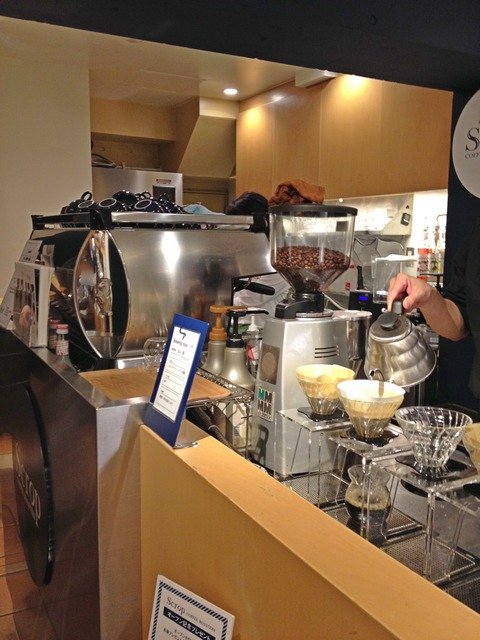 奥まった入口を入るとすぐ左手にカウンターが有り、奥のtakeout窓脇にあるマシンはSIMONELLIのAppia Compactか。カウンターにはHARIOの円錐ドリッパーが並ぶ。