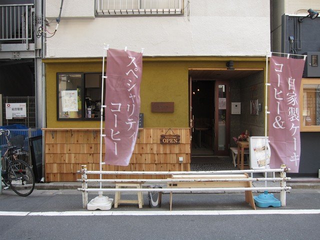 最寄り駅はたしかに築地だが、そこから月島方面へ7,8分ほど、場所は聖路加病院の南側あたりの運河が近い古い家屋密集地帯とマンションが入り乱れるエリア。その一角にコーヒーの幟が出ている一軒のお店が。