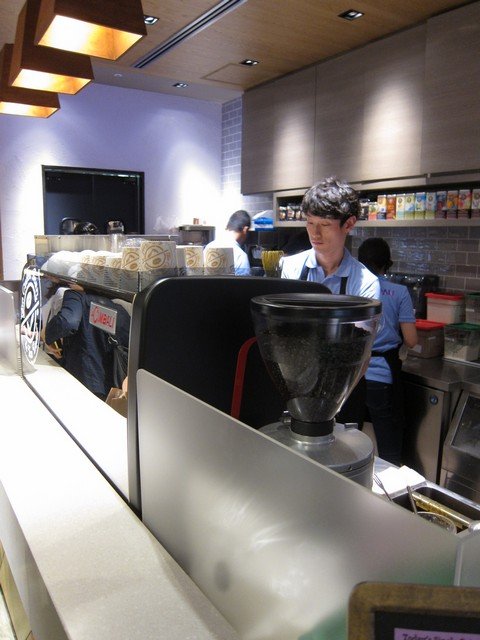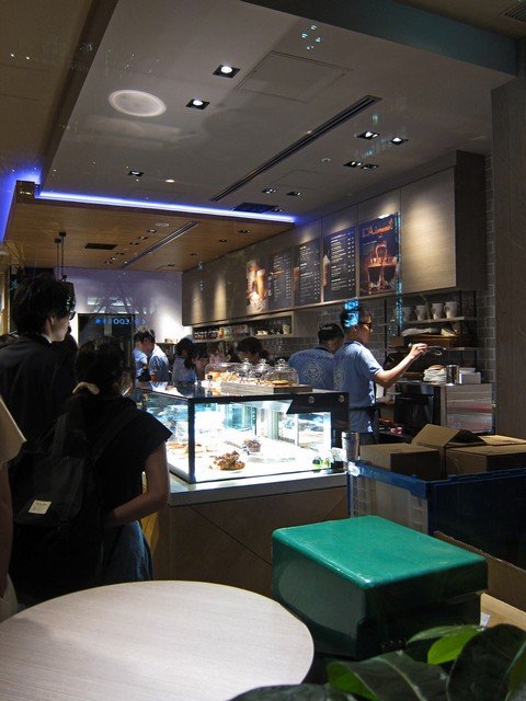 この日は交差点側のテラス席は行列用のスペースに割く為使用しておらずて、30分ほどして中に入るが、東側から入って右手にレジ、バリスタカウンターと続けてあり、その内ではスタッフの方々がてんやわんや。