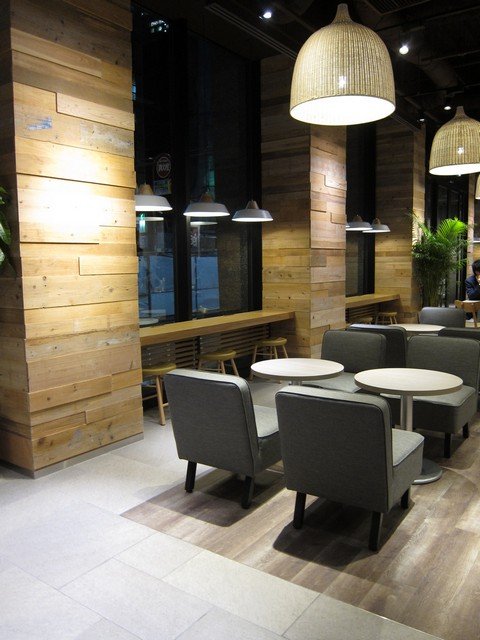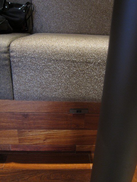 そして、中央の大テーブル席の袖面4ヶ所に2口コンセントが設置されている。その他電源に関しては事前報どおりかなり充実しており、南側カウンター席(3席×3)各2ヶ所、レジ前ベンチシート(5席)足元5ヶ所、西端ベンチシート足元3ヶ所に2口コンセントがあり、自由に使用可能。