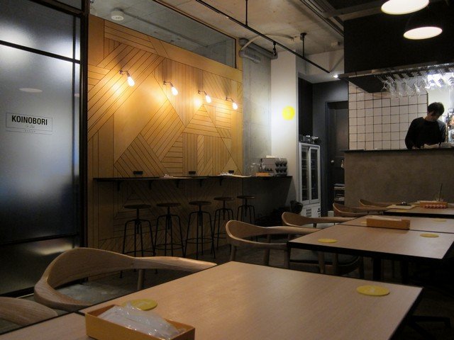 客席は左手にテーブル席が1組、奥にカウンター席が4席ほど(おっとここの壁面にはコンセントが設置されている)、右手はベンチシートを含めたテーブル席が12席。一番奥にカウンターとキッチンといった構成。奥に見えているエスプレッソマシンはLA MARZOCCOのLINEA CLASSICか。