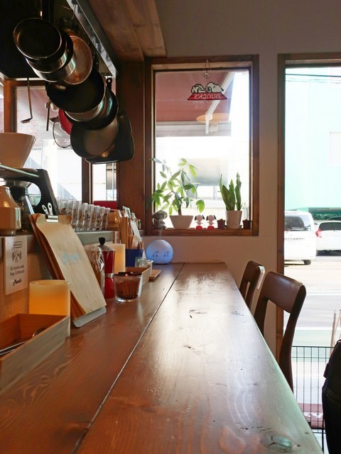 客席はシンプルなハコにこのカウンター席4つと窓際に3つ、中央にソファー席2席1組とベンチ少々といった構成。