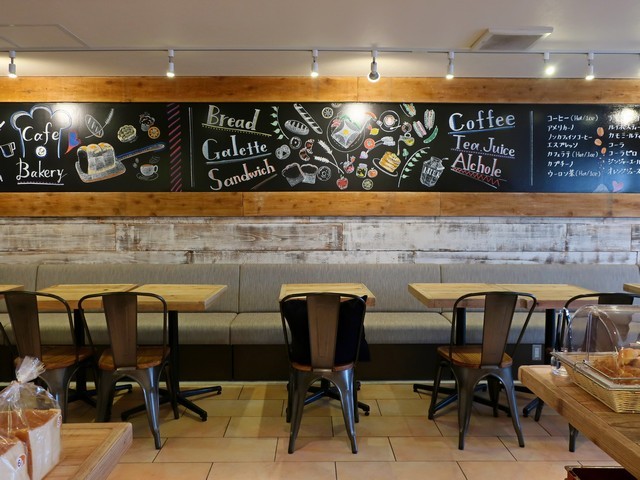 入ると正面にパンの販売のエリア。中央の衝立裏側がモーニングパンのバイキングエリアとなる。正面奥にレジが有り、そのさらに奥がキッチンといった構成。