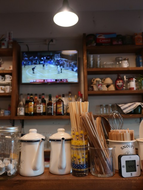 店主の好みなのかスヌーピーなグッツがあちこちに見受けられ、キッチン後方では店主のもう1つの本業と関連してBリーグの中継が流されている。