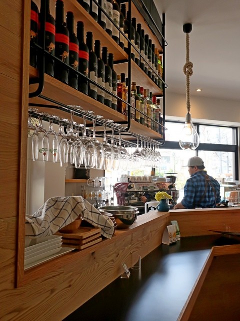 キッチンは北側に細長くあり、その客席から想像して解るとおり、ワイン多めのキッチンストック。エスプレッソマシンの脇にはAllpress Espressoな豆袋。