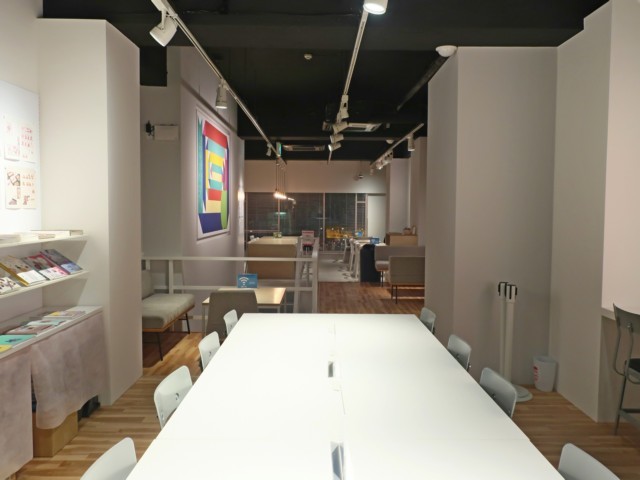 2Fは東西に長い40席強の大箱。奥の大テーブル席中央やカウンター席にはコンセントが設置され、ワークショップが出来るような作りになっている。