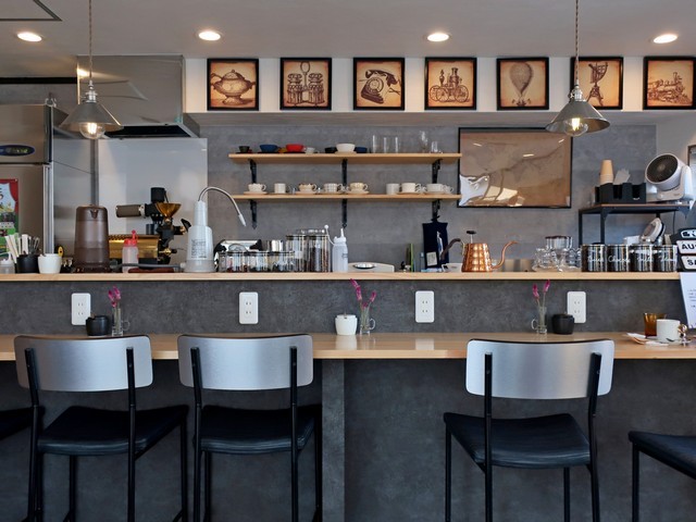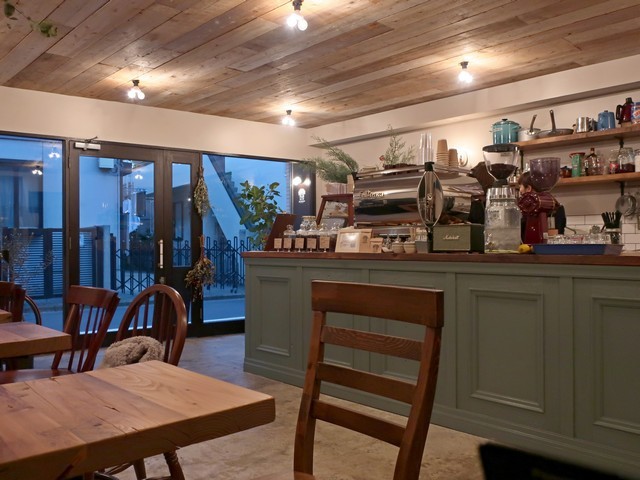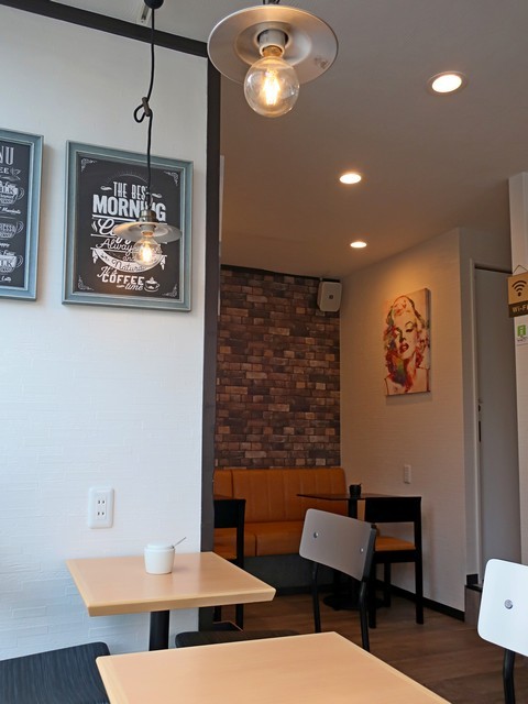 カフェ自体はキャッシュオンスタイルを取り、左手にカウンター席が3つ(両端袖面にコンセントあり)、右手壁面に沿ってテーブル席が2組4席とこじんまりとした構成。メニューはカウンター脇の黒板に色々と。