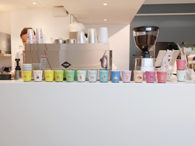 カウンターの続きにVBMのエスプレッソマシン(おそらくreplica)が置かれ、カラフルな紙カップで装飾。おっと壁面上にはCISCO MerakiのMR42が。
