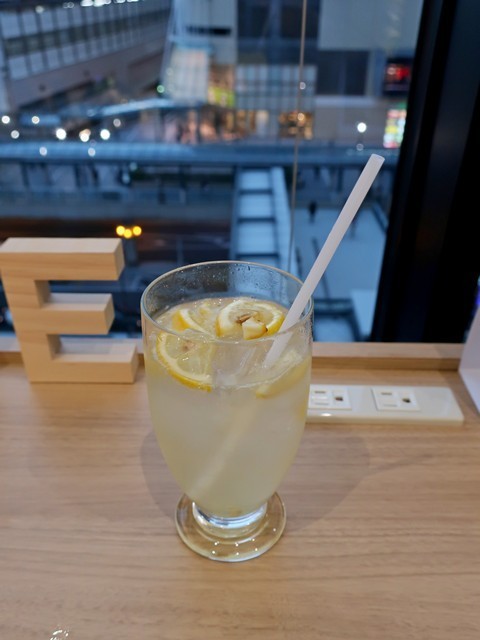 裏側の窓際にカウンター席が14席ほどあり、テーブル面7ヶ所にアース付2口コンセントが備え付けられる。勿論窓からは駅南口を見下ろせる風景が。