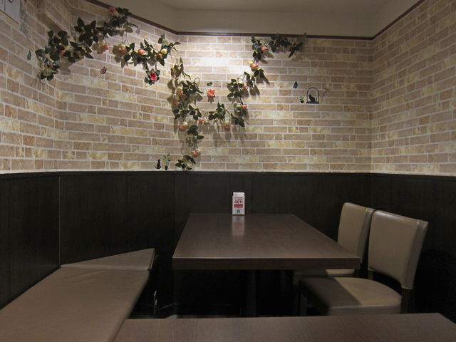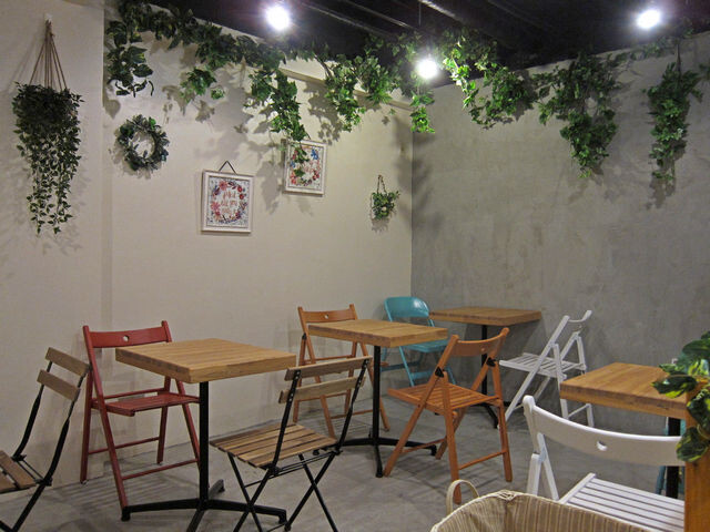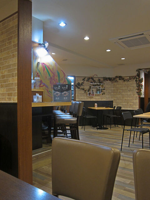 客席は左手壁面に沿ってテラス席で使われてそうな椅子のテーブル席が12席と奥にカウンター席が4席ほど。