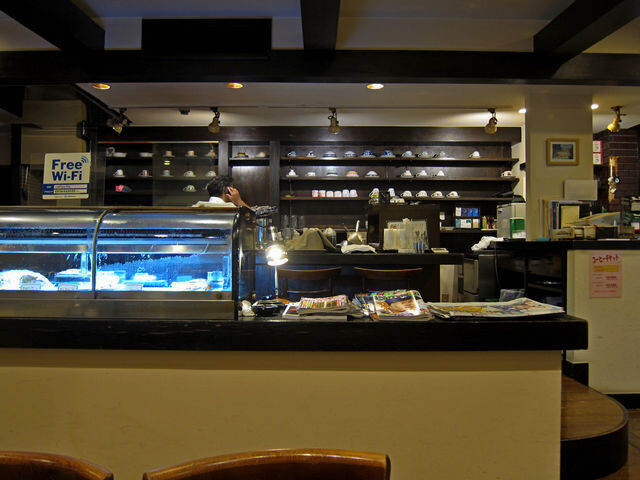 入るとブラックをベースとしたハコ。右手がカウンターとキッチン、壁面にカップとソーサが並べられ、中央に新聞が置かれた棚とケーキ類の入ったガラスケースという珍しい配置。