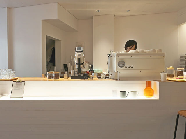 入ると奥に長いハコ、右手のカウンターは一番手前がレジ、続いてショップのカウンターを兼ね、奥にはNespressoのアグイラ220が鎮座する。
