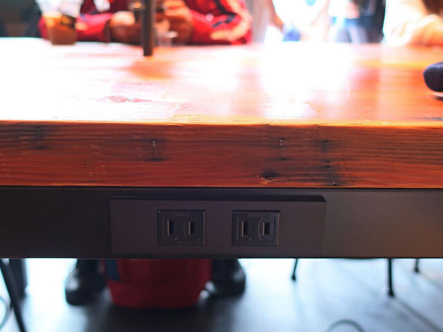 西側から入るとすぐ正面に写真のようなコンセントのある大テーブル席があり、その奥にカウンターがあり、キャッシュオンスタイルをとる。