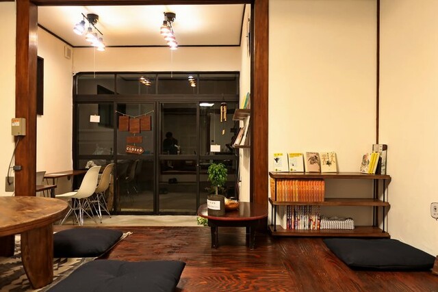 奥の床の間手前に2人がけテーブル席が1組、左端にソファーのある4人がけ席が1つといった構成。キッチンは入った左手奥の台所だった場所にカウンターがある。窓は障子戸と昭和のおうち感満点。また、ところどころの柱にはコンセントがあり、電源が使える旨サインが出されている。