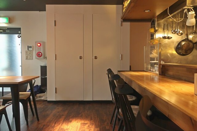 入るとバー色の強い店内、右手(北側)にテーブル席が4席2組、2席2組ほど、左手にキッチン前のカウンター席が5席といった構成。バックカウンターにはカクテル類ボトル等が並べられる。ちなみにカウンター脇にはLA MARZOCCOのLinea Miniが鎮座する。