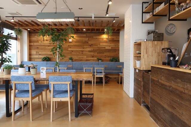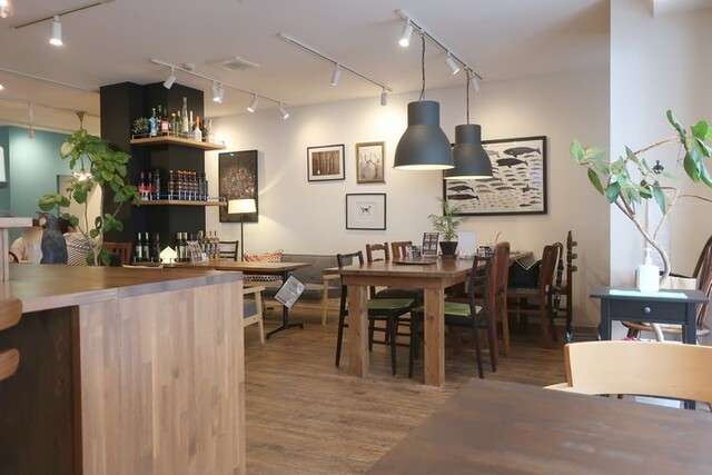 入ると正面にカウンターがあり、キャッシュオンスタイルをとる。客席は観葉植物が適度に配されたフロアにテーブル席が20席ほど、うち8席は中央の大テーブル席といった構成。