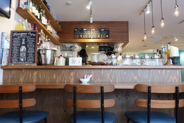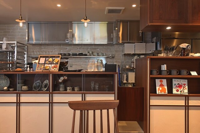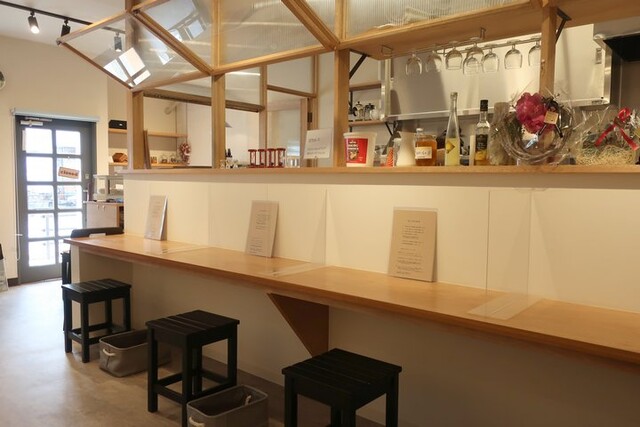 キッチンは左手にあり、手前にカウンター席が3つ、といった構成。その他入口手前脇にもテラス席が1組設けられている。