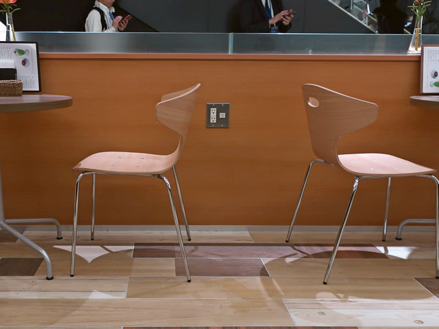 入ると奥の広いフロアが二段ほど下がってイベントができるような配置になっており、20組40席程度のテーブル席が配される。場所の目的上もちろんコンセントもテーブル裏に完備。そして会場を見渡せるようにカウンター席が10席ほどあり、客席となるカウンター席にも1口コンセント+1口USBポートとLAN口を装備(ただしLANの使途については未確認)。