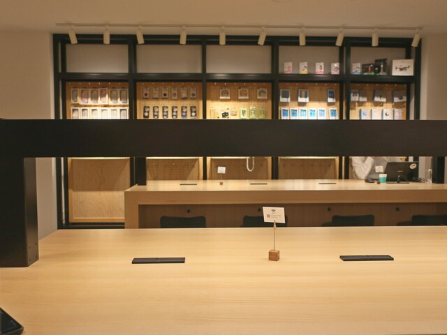 客席は入口左手のカウンター席から奥まで全部腰掛けなしのカウンター席という36席程度の構成。奥の窓際のカウンター席を除きだいたいのテーブルに2口コンセントが装備される。南側奥の壁面には携帯電話ショップらしくグッツ類も。