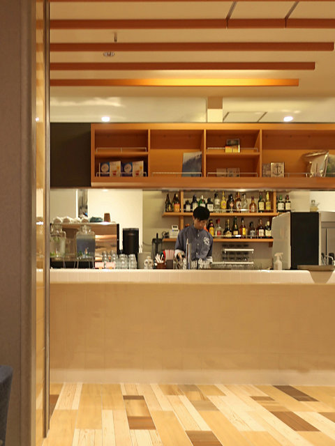 入ると明るめのハコに東西に長く革張りのベンチシートを主体とした40席超のハコ。左手(東側)にカウンターとキッチンがあり、ベンチシートの足元にはコンセントが備え付けられる(2口×10数カ所)。