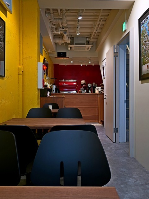 ビルが3Fというのは、表(東側)の通りと裏側と両側に面しており、裏側がフロア的に3Fとなる位置づけ。カウンターはビル入口脇にあり、階段を上がった上階がイートインスペースといった変則的構成。厨房の奥にあるマシンはLA MARZOCCOのLINEA mini。