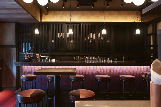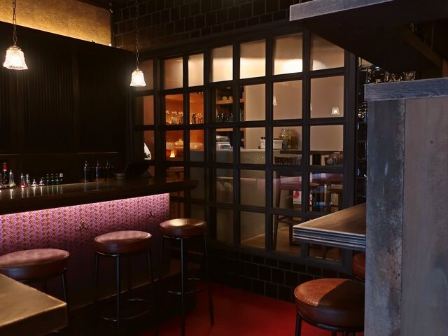入ると薄暗く和モダンな空間、入口脇と左手バーカウンターにカウンター席が計8つ、中央と右手にテーブル席が10席ちょっと。右手奥が上部に自店名のステンドグラスがはめ込まれた厨房といった構成。