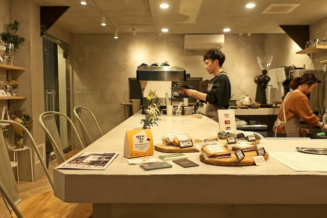 入るとすぐ正面にガラスケースがビルトインされたカウンターがあり、左手にSynessoのS200が。キャッシュレス決済プラットフォームはSquareでキャッシュオンスタイルをとる。