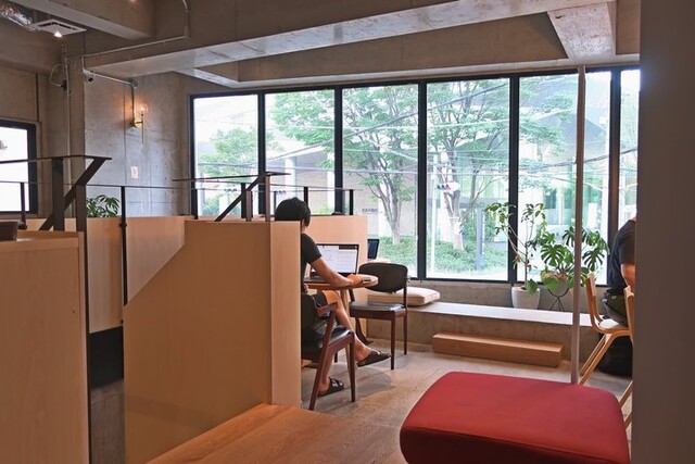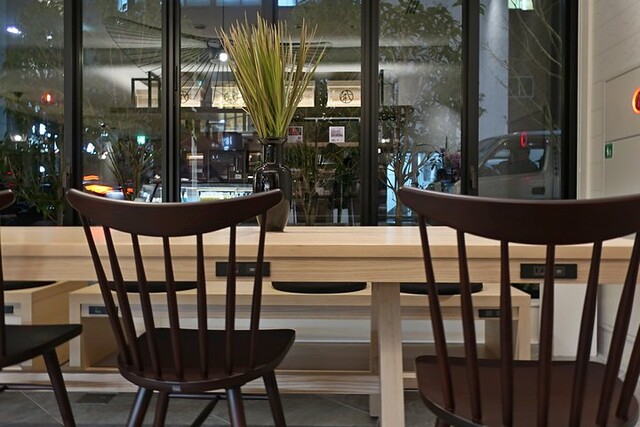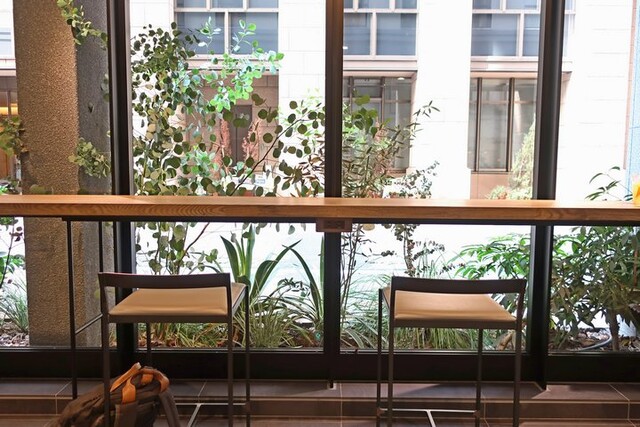 客席はその南側、ビルのエントランスに沿って窓際にカウンター席が12席ほどのシンプル構成。テーブル下にはコンセントが備え付けられる。