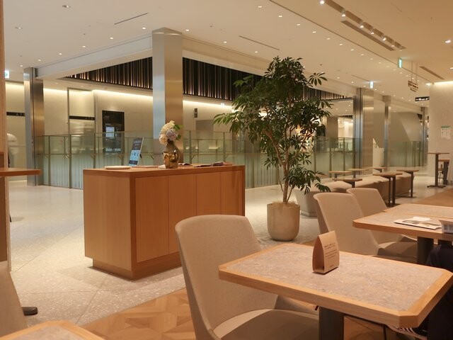 中央は主に腰掛け用のソファーがあり、ビルの吹き抜け部とほぼツーツーな空間。この日は土曜の13時頃、お客さんは2割程度だがベンチ席は間を空けていることもあり、ほぼ埋まった状況。今回は様子見で…