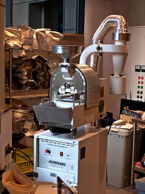 入ると正面すぐにカウンターが左右長くあり、左手の奥に小さな焙煎機が鎮座する。