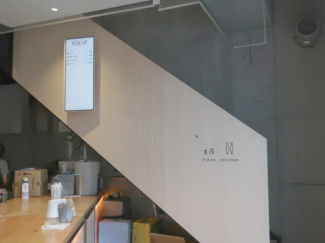 (この写真だけプレオープン時のもの)客席は右手に8人ほどのベンチが壁面に沿って奥まであり、右手すぐの柱脇に2,3人分ほどのスタンディングテーブル。一番奥の角にテーブル席が2組4席の構成。コンクリ打ちっぱなしのハコ故にスッキリとした印象。