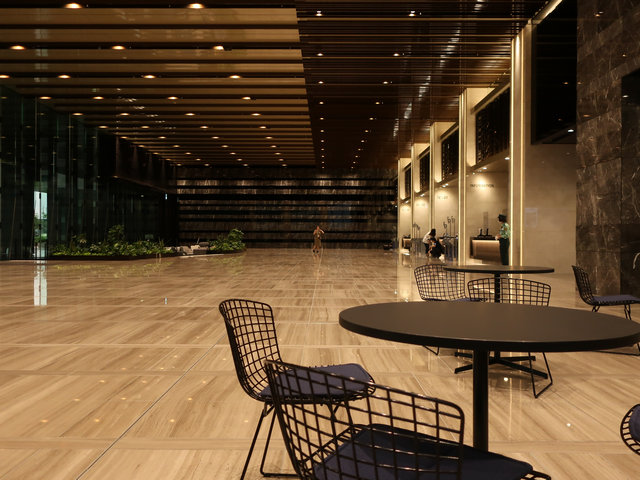 客席はオフィスエントランスロビーの北側にテーブル席が20席弱ほど。(それにしても無駄に豪華なオフィスエントランスだこと…(コンセントはないけどな!))