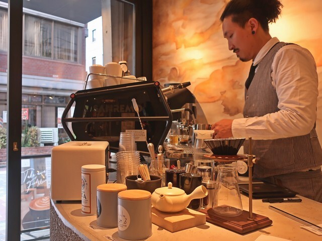 入ると左手にSANREMOのCAFE RACERが鎮座する。その奥からカウンターとキッチンといった構成で、脇にはカネ十農園の茶筒がディスプレイされる。
