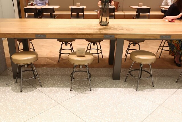 客席は右手から奥にかけてあり、バリスタカウンターの続きのカウンター席が4席、中央に大テーブル席8つ、窓際に沿ってカウンター席が12席があり、うち大テーブル席と窓際カウンター席にはコンセントを備える(計10ヶ所)。barと名が付くからにはカウンター上の棚にはアルコール類がびっしりと。